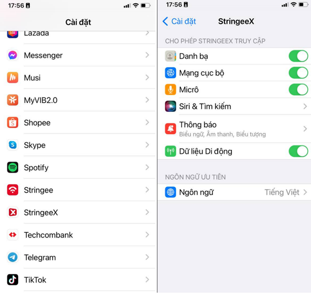 * **Step 1:** At the settings, users go to Settings => StringeeX to set up notification for the StringeeX app
