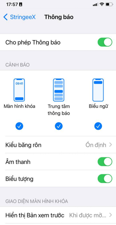 * **Step 2:** Turn on "Allow Notifications". After allowing notifications, check to allow notifications on Lock Screen, Notification Center, Banners. Note: in the section "Banner Style" to select "Persistent":