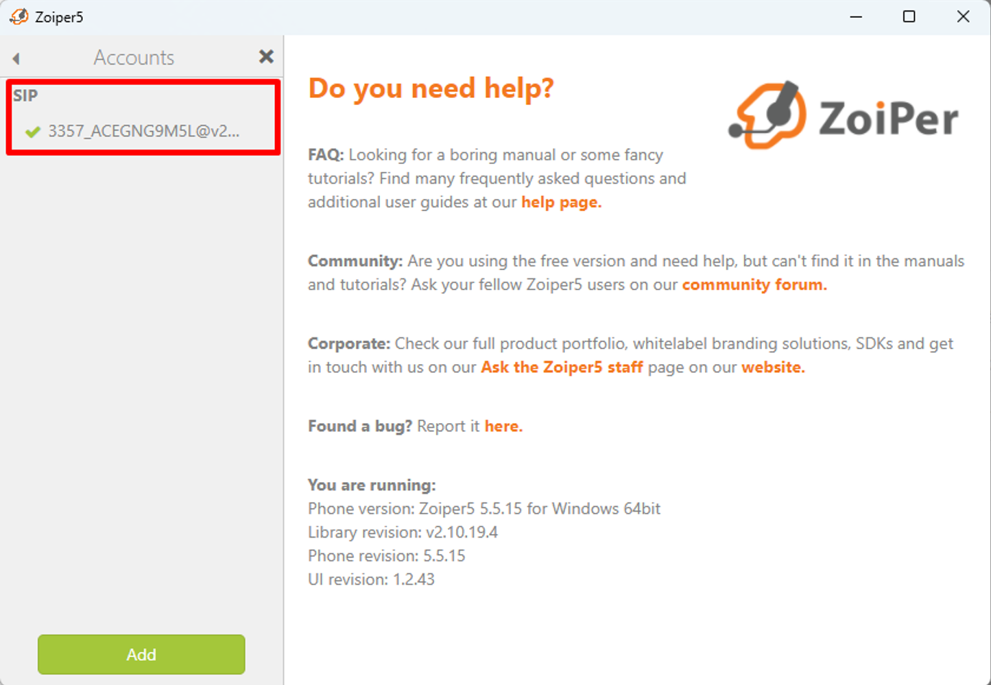<figure><img src="https://content.gitbook.com/content/W1nWhVvoi55dxT8euy3M/blobs/8tWW1ekg7QBB8TzDuGjG/image.png" alt=""><figcaption><p>Image 25: SIP account on Zoiper</p></figcaption></figure>