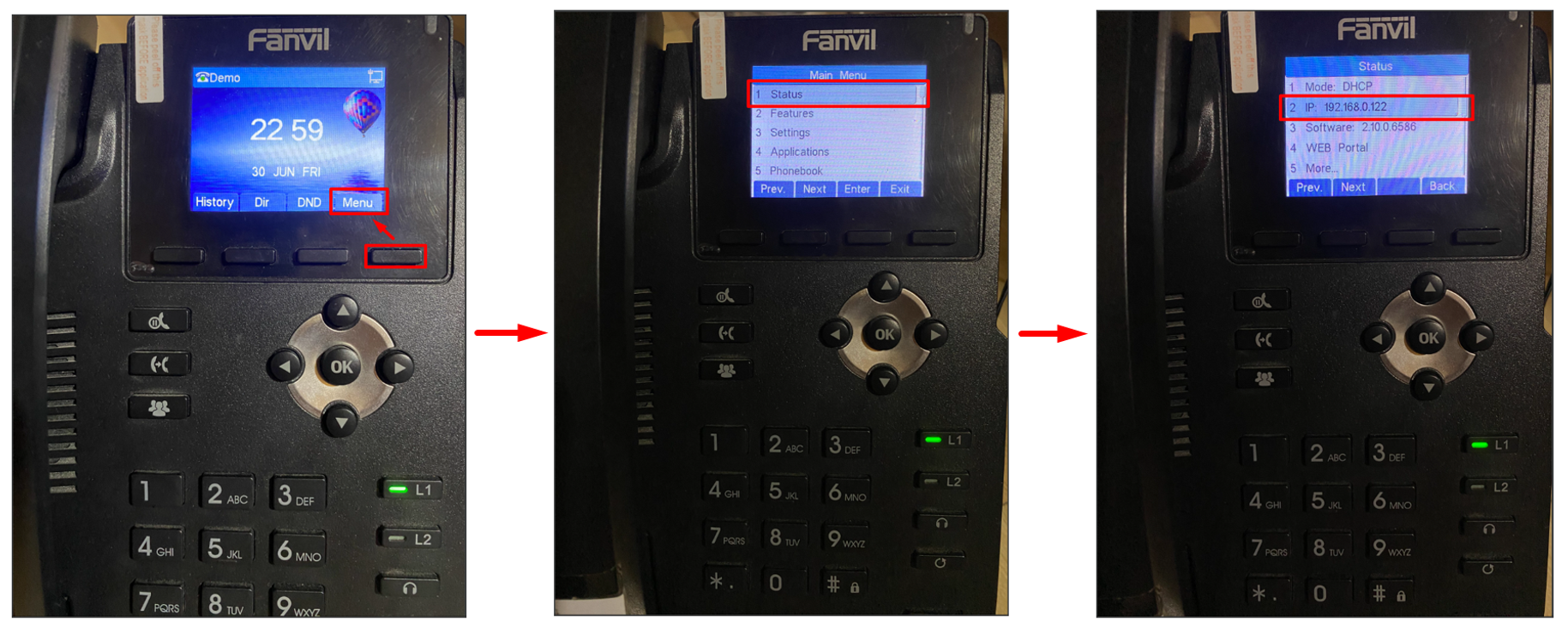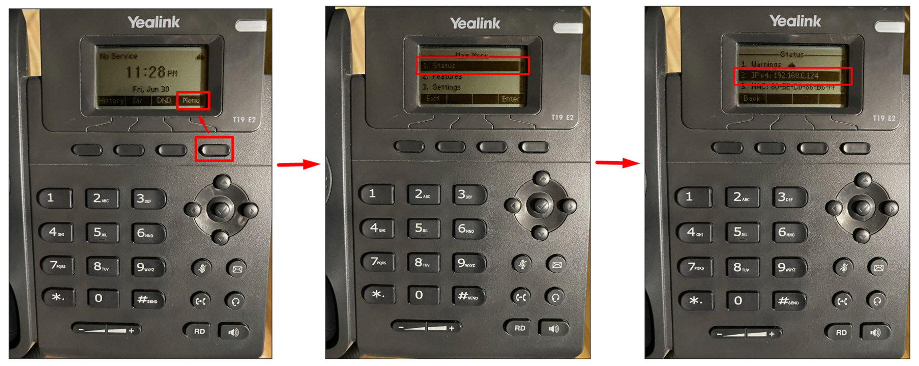 Access “Menu” depending on the key on the IP Phone device => “Status” => “IP”.