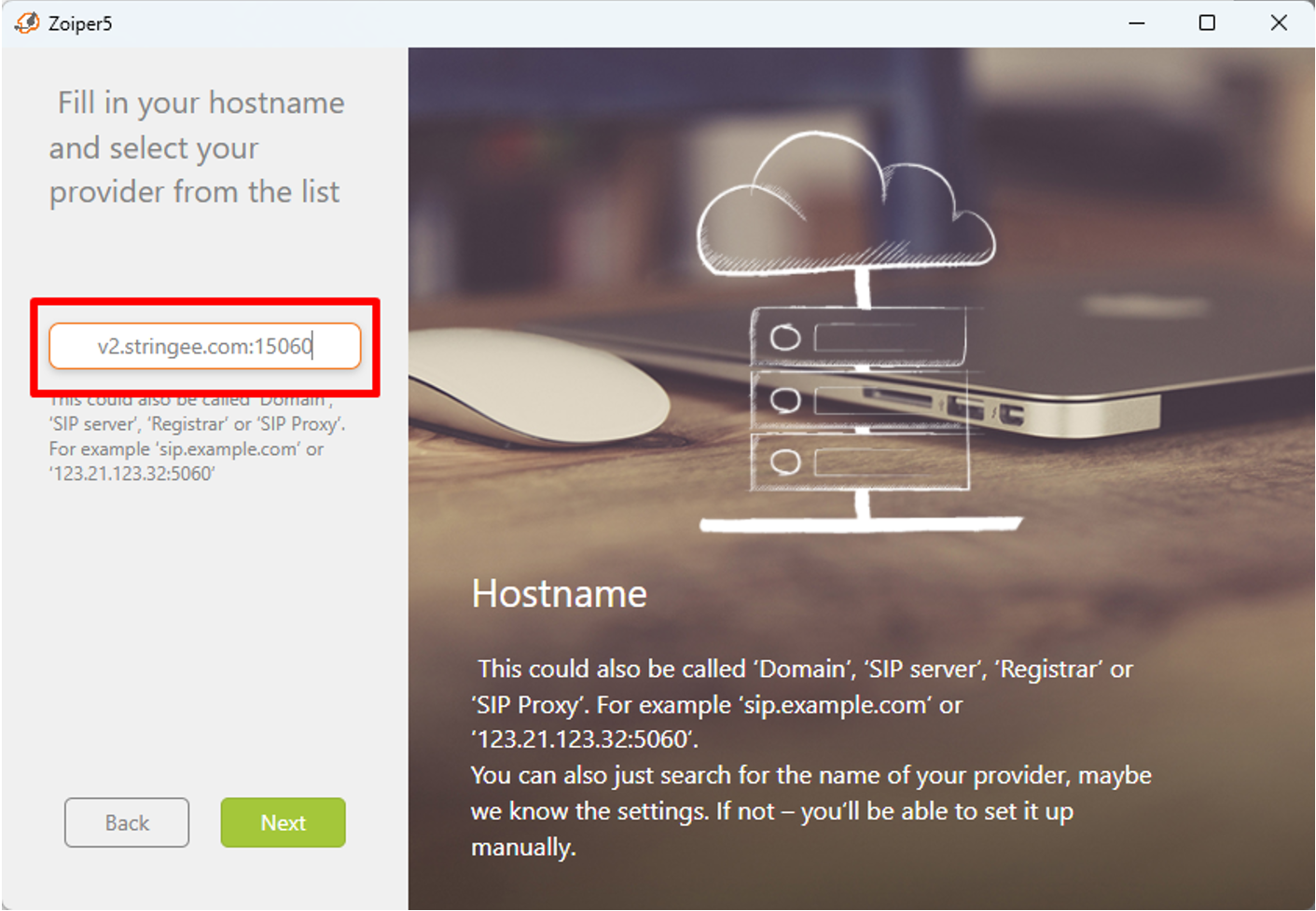 The user enters Stringee domain: **sip-register-india.stringee.com:5262** and selects “Next”.