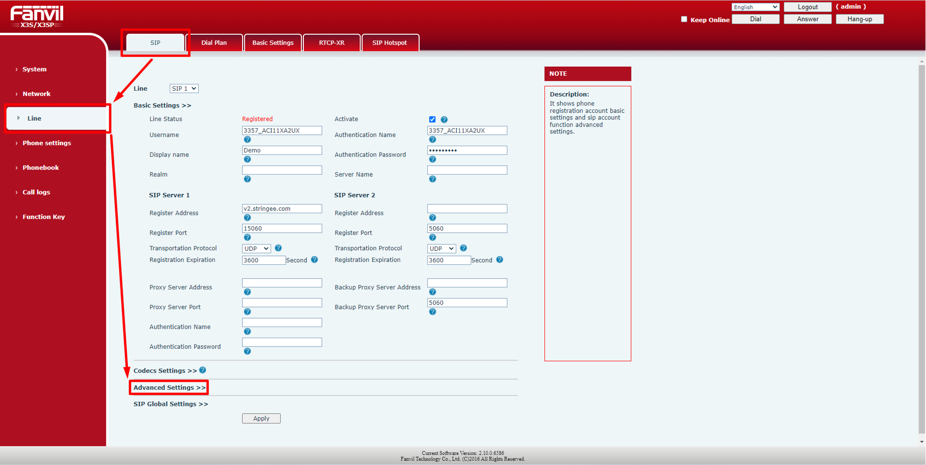 Still at the path "SIP" => "Line", users access "Advanced Setting".
