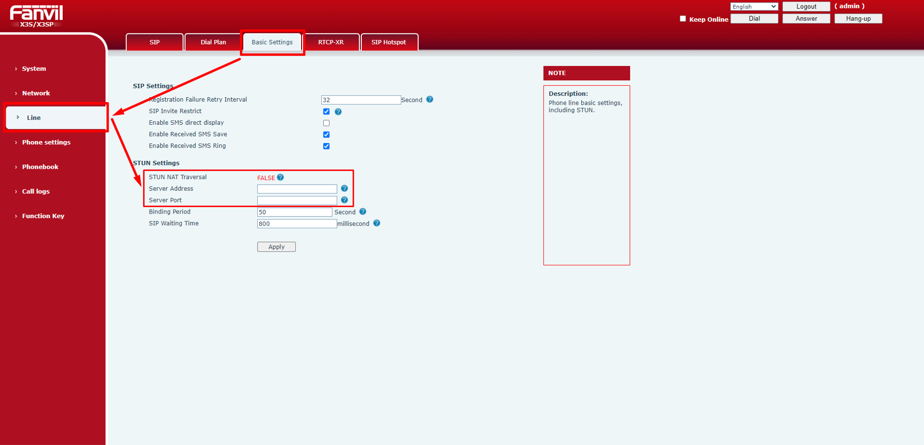 Users access the path: "SIP" => "Line" and complete the information items circled in Image 12. The remaining items can be kept as they are without changing the information.