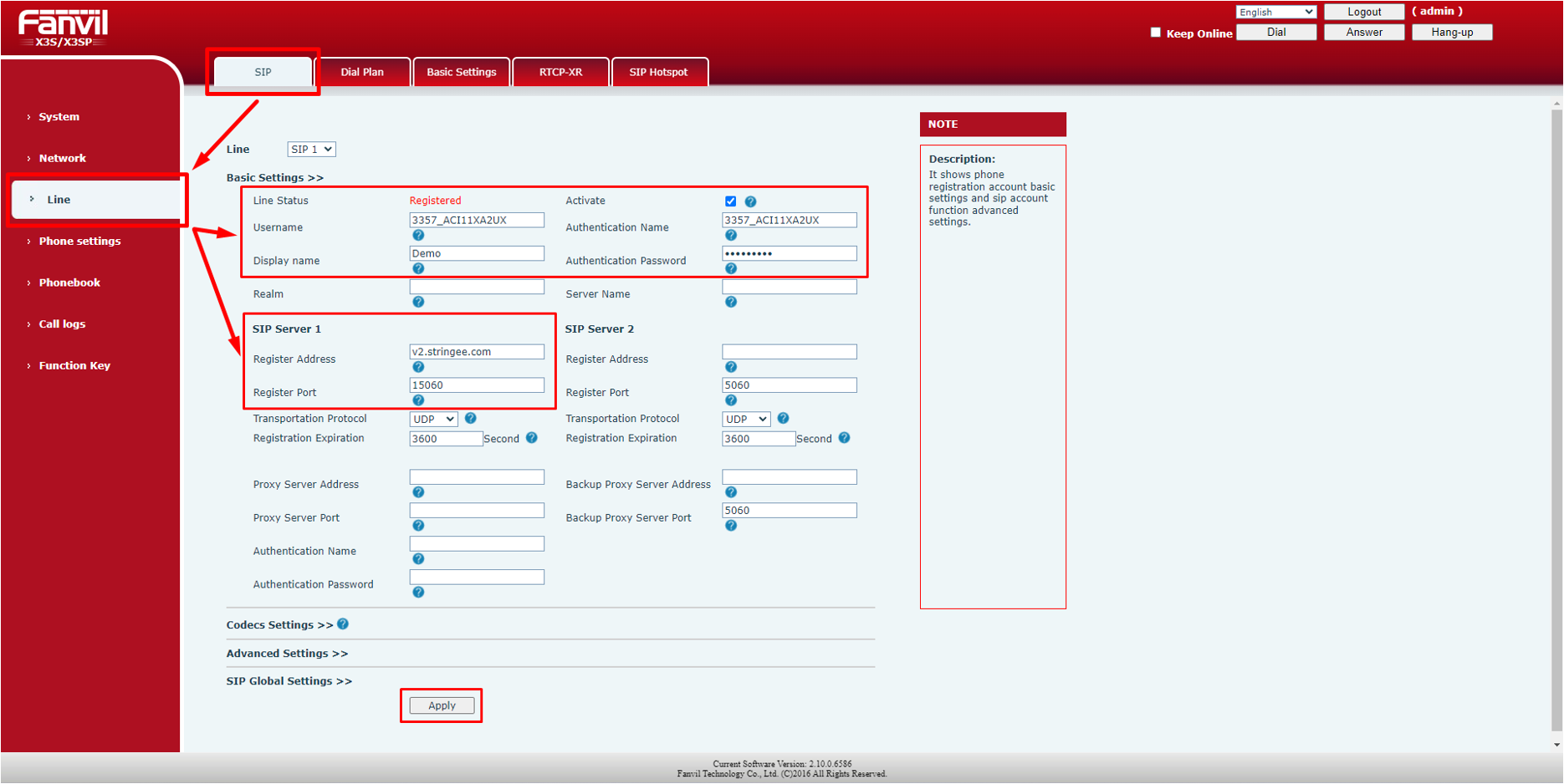 Users access the path: "SIP" => "Line" and complete the information items circled in Image 9. The remaining items can be kept as they are without changing the information.