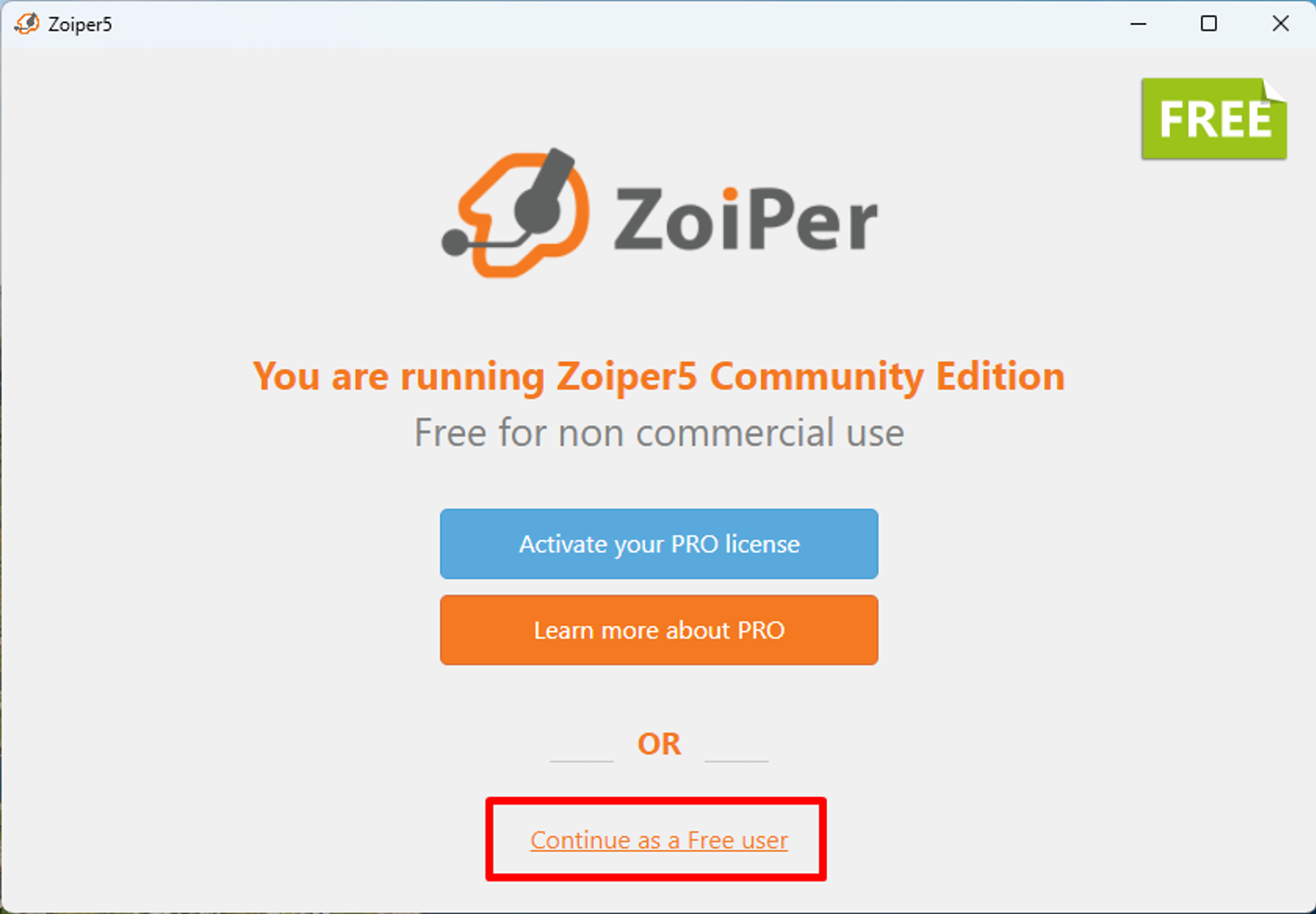 In the interface after installing Zoiper, the user selects "Continue as a Free User".