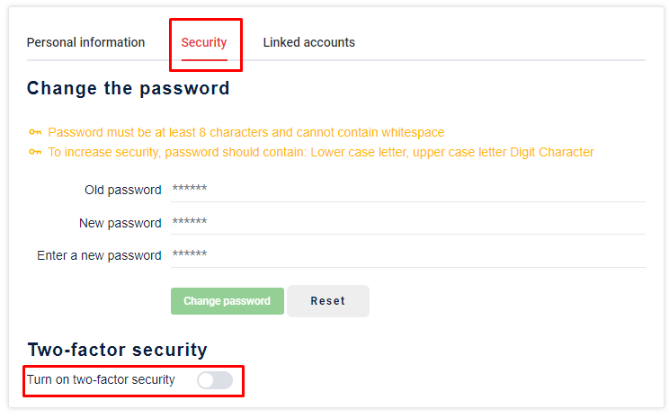 Click on the Security tab on the screen => select Turn on two-factor security