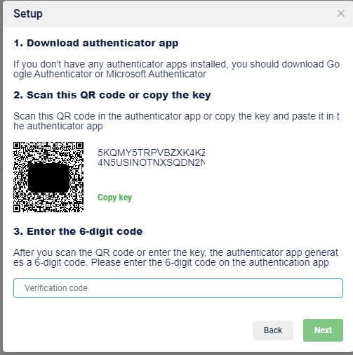 Use the authentication app to scan the code on the screen, then enter the code generated by the app into the popup to complete the authentication
