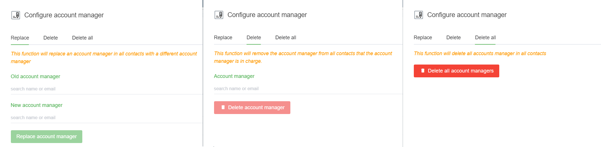 * **Replace:** This function will replace the management account in all contacts to another account. The function also changes the assignment field to the new agent with the corresponding contact tickets
