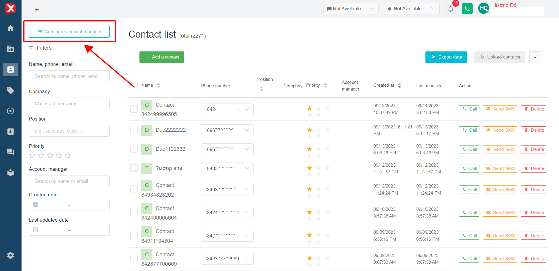 StringeeX supports an advanced feature **Account manager configuration** which supports new agents to manage contacts and tickets of old agents through the interface [Contact](https://help.stringeex.com/stringeex-tong-dai-cham-soc-and-quan-ly-khach-hang/en/ii.-system-features/3.-contact/3.1.-contact-management).