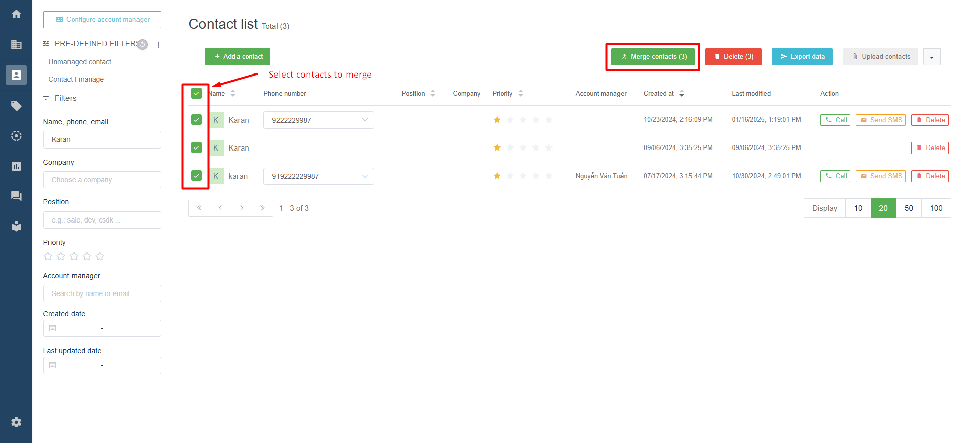 **If the contacts are duplicated at the Contact interface, the user ticks on duplicated contacts, the "Merge contact" option will appear as shown in the image below.**