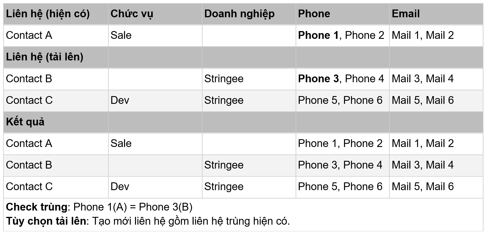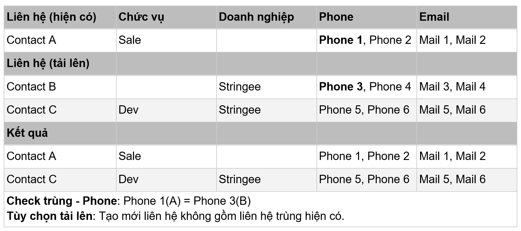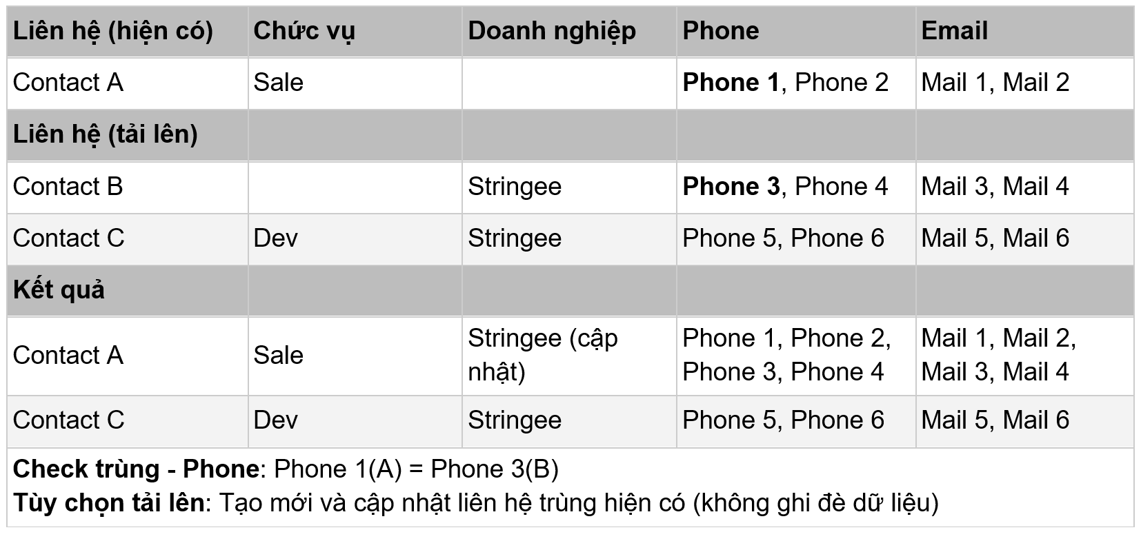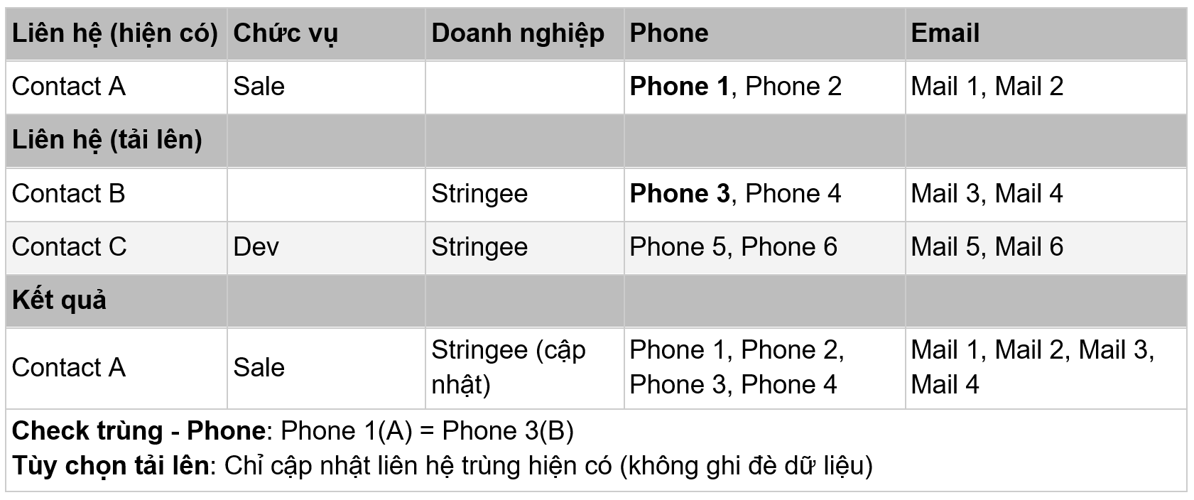 Tạo mới và cập nhật liên hệ trùng hiện có (không ghi đè dữ liệu): Tải lên liên hệ mới, cập nhật bổ sung thông tin còn trống và không ghi đè lên dữ liệu đã có với liên hệ trùng dữ liệu chọn