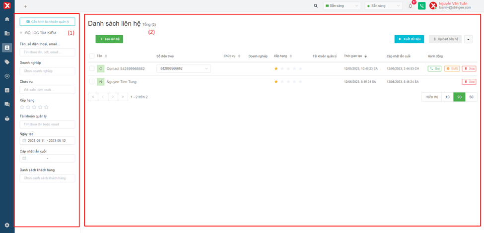 StringeeX hỗ trợ tính năng nâng cao Cấu hình tài khoản quản lý, hỗ trợ nhân sự mới quản lý các liên hệ và phiếu ghi của nhân sự cũ thông qua giao diện Liên hệ.