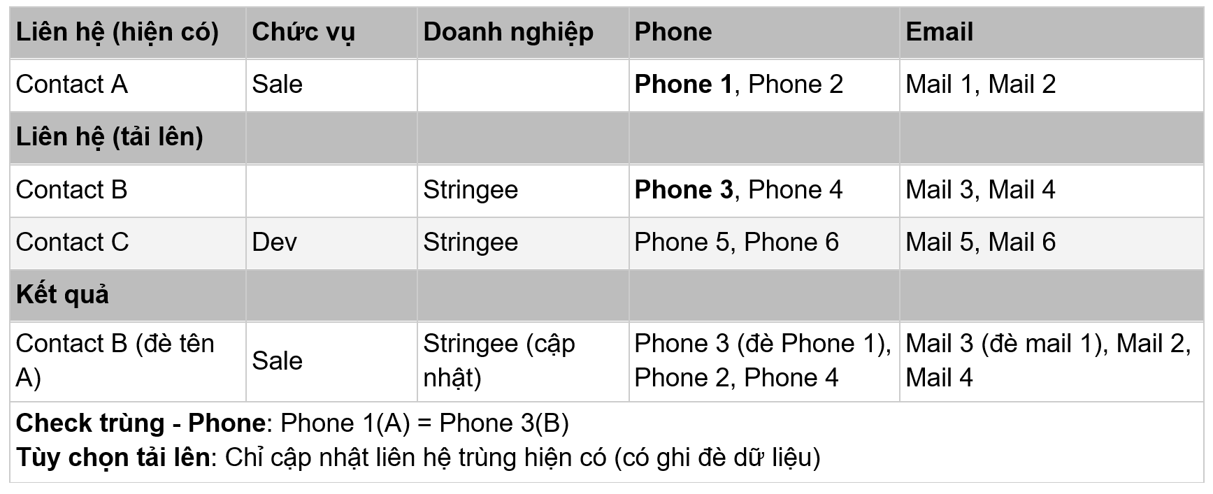 Tạo mới và cập nhật liên hệ trùng hiện có (có ghi đè dữ liệu): Tải lên liên hệ mới, cập nhật bổ sung thông tin còn trống và ghi đè bản ghi đầu tiên với liên hệ trùng dữ liệu chọn