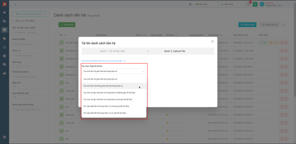 Màn hình Liên Hệ => Click vào Upload liên hệ. Popup tuỳ chọn hiện ra như hình minh hoạ
