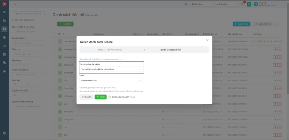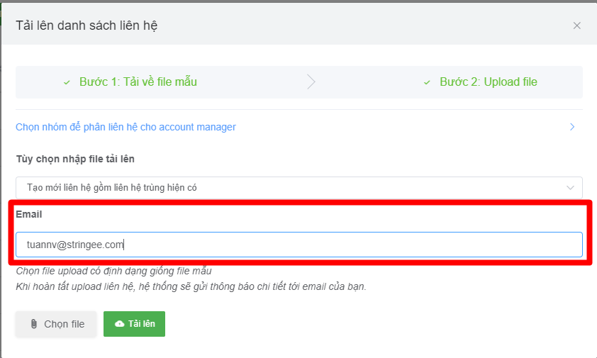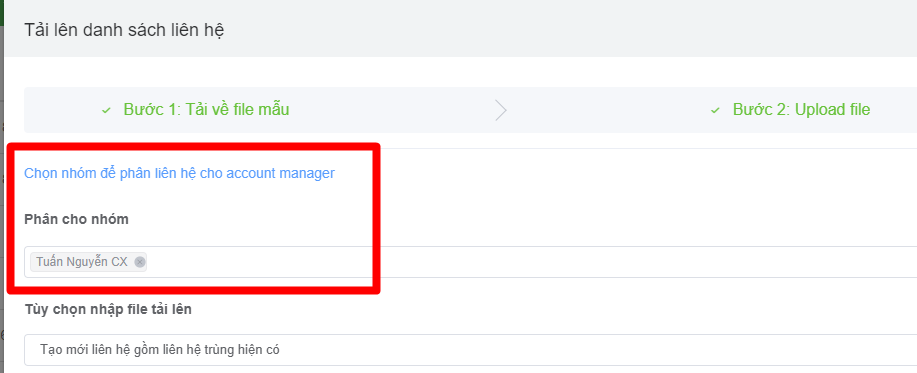 Lưu ý: StringeeX cho phép người dùng upload liên hệ cho người quản lý (supervisor) trong nhóm, khi upload chọn "Chọn nhóm để phân liên hệ cho account manager"