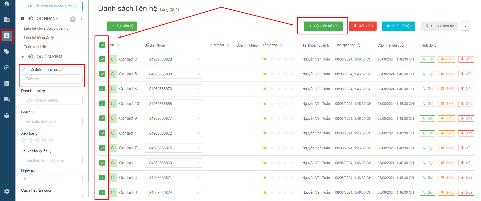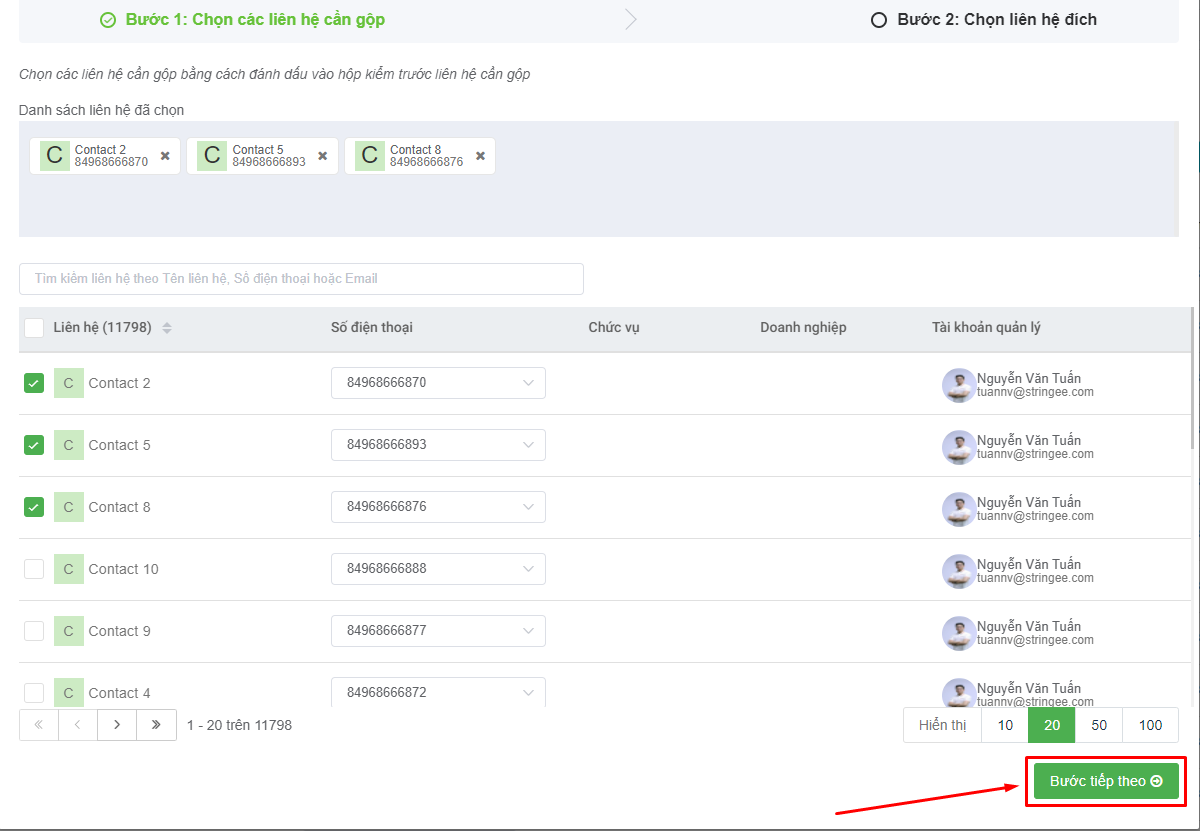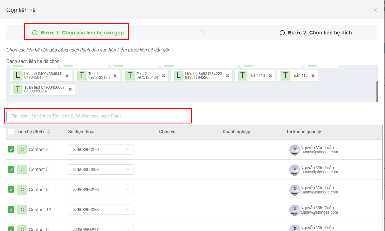 Tại bước này người dùng tìm chọn những liên hệ cần gộp lại bằng cách chọn vào ô trigger trước liên hệ như hình, sau khi chọn liên hệ nhấn "Gộp liên hệ".