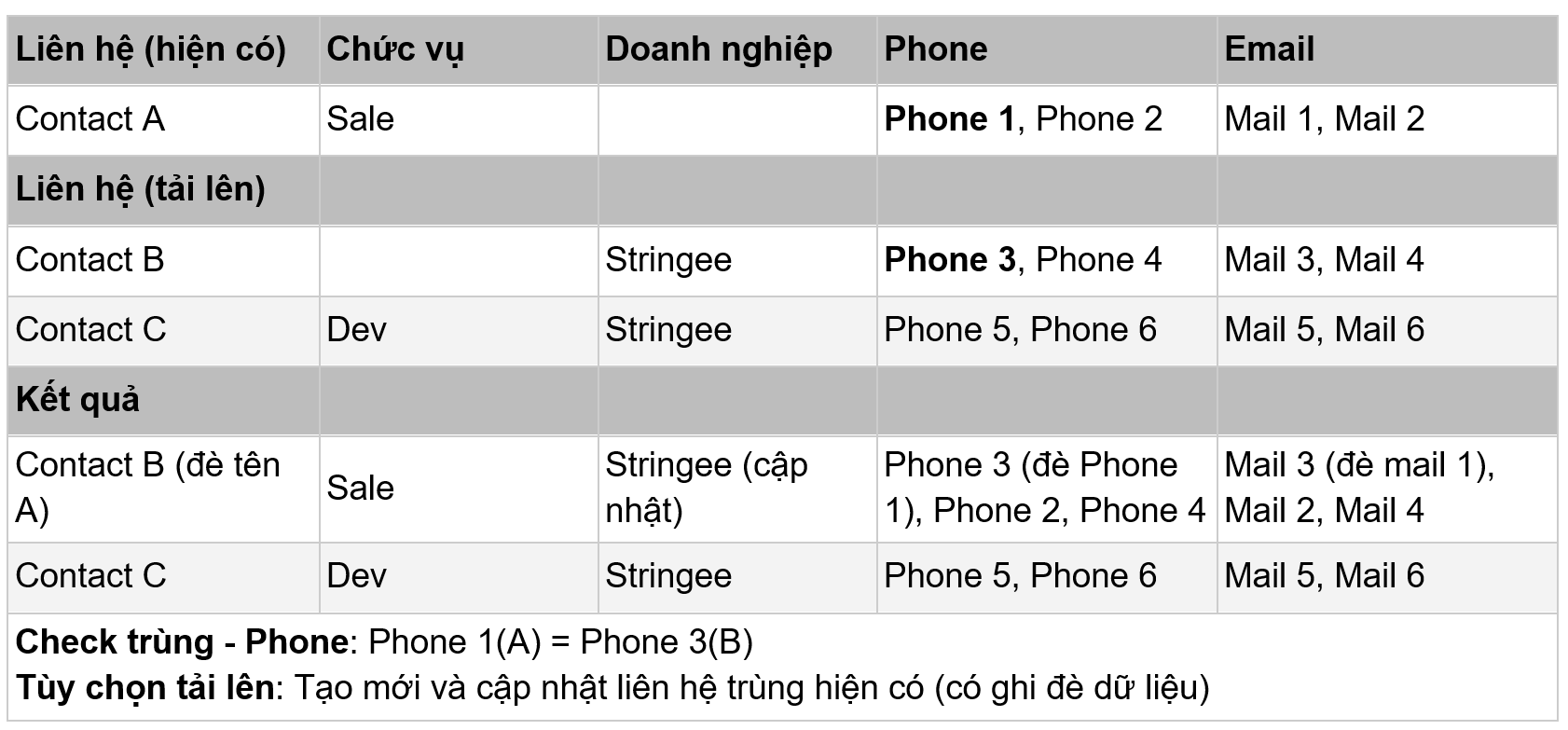 Chỉ cập nhật liên hệ trùng hiện có (có ghi đè dữ liệu): Không thêm liên hệ mới chưa có, chỉ cập nhật bổ sung thông tin còn trống và ghi đè bản ghi đầu tiên với liên hệ trùng dữ liệu chọn