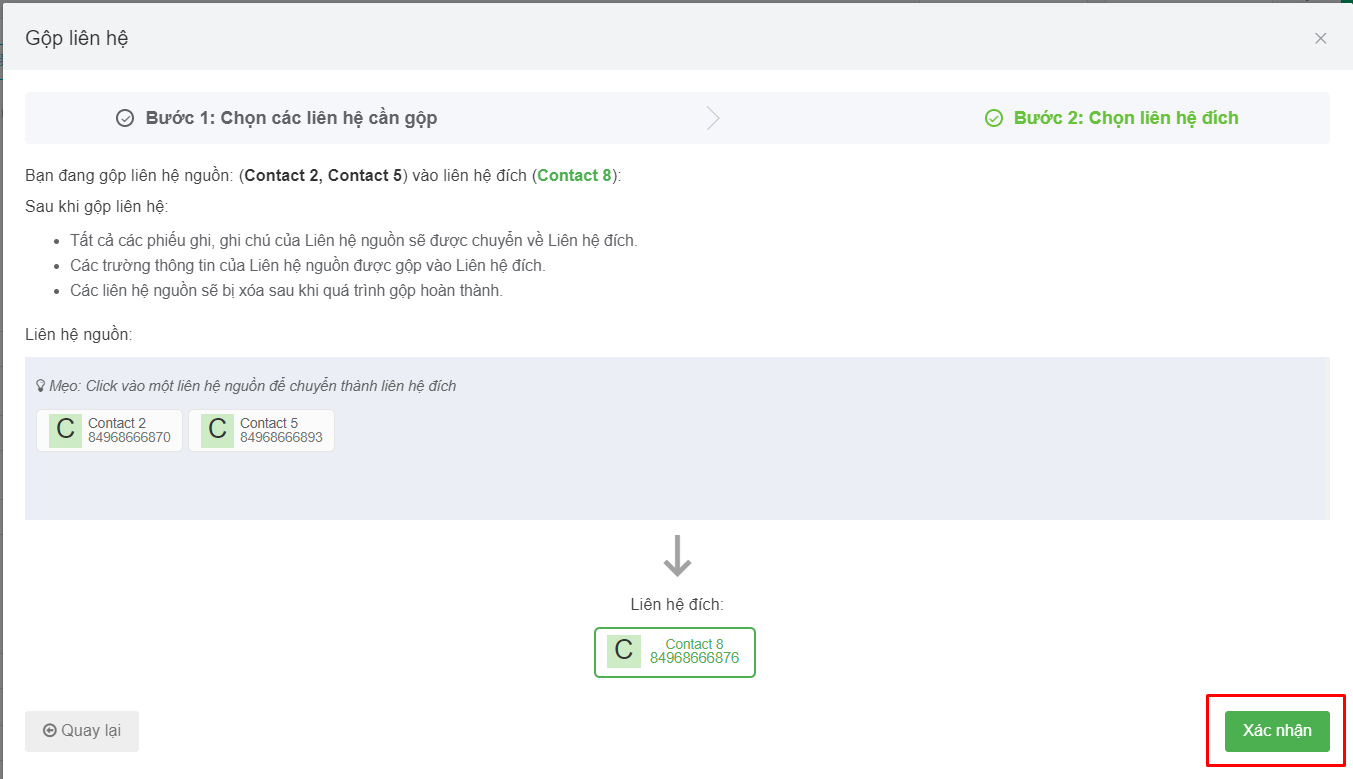 Tại bước này là chọn liên hệ đích (liên hệ được giữ lại cuối cùng, mang thông tin của các liên hệ cần gộp lại). Người dùng click chọn liên hệ đích cần giữ lại và bấm "Xác nhận" để hoàn tất quá trình gộp liên hệ.