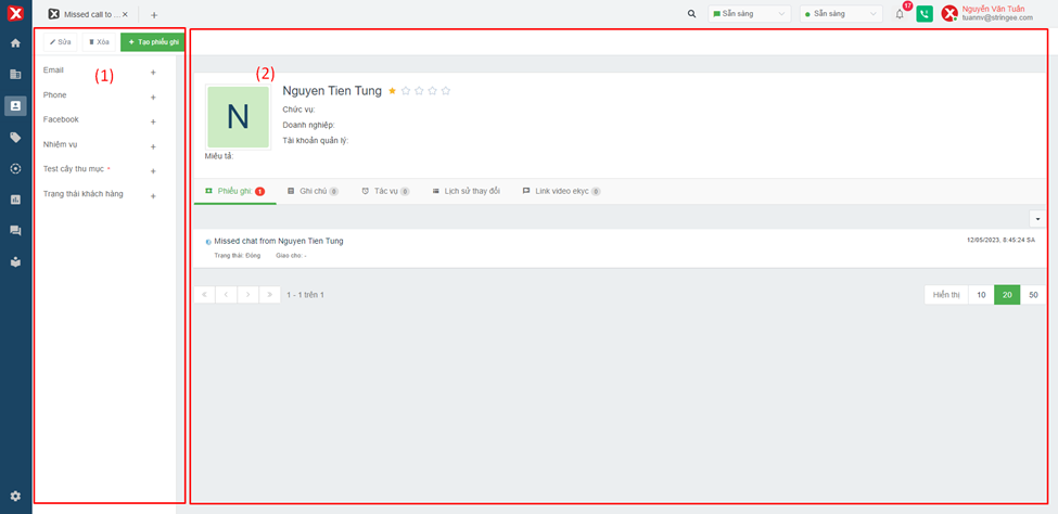 * **Phiếu ghi:** liệt kê các phiếu ghi được sinh ra bởi liên hệ có “trường liên hệ” trên hệ thống là liên hệ tương ứng. Phiếu ghi được liệt kê theo thời gian gần nhất từ trên xuống dưới, người dùng chọn các trang tiếp theo để xem thêm các phiếu ghi của liên hệ tương ứng