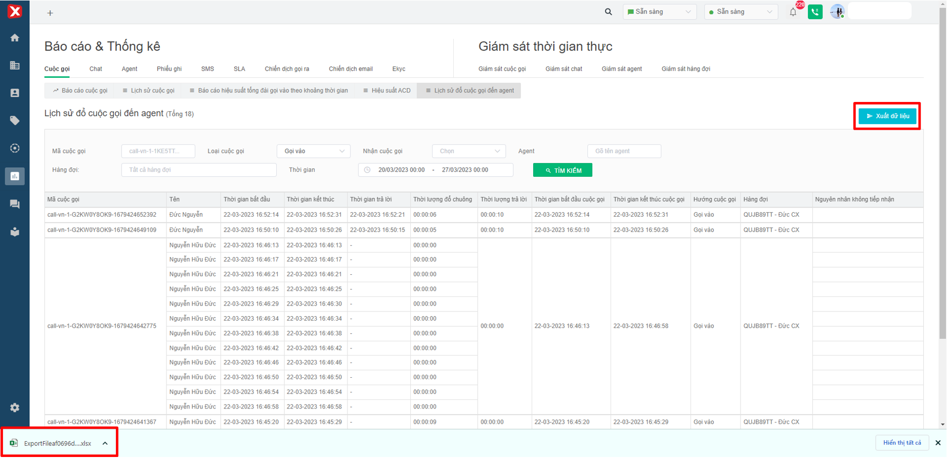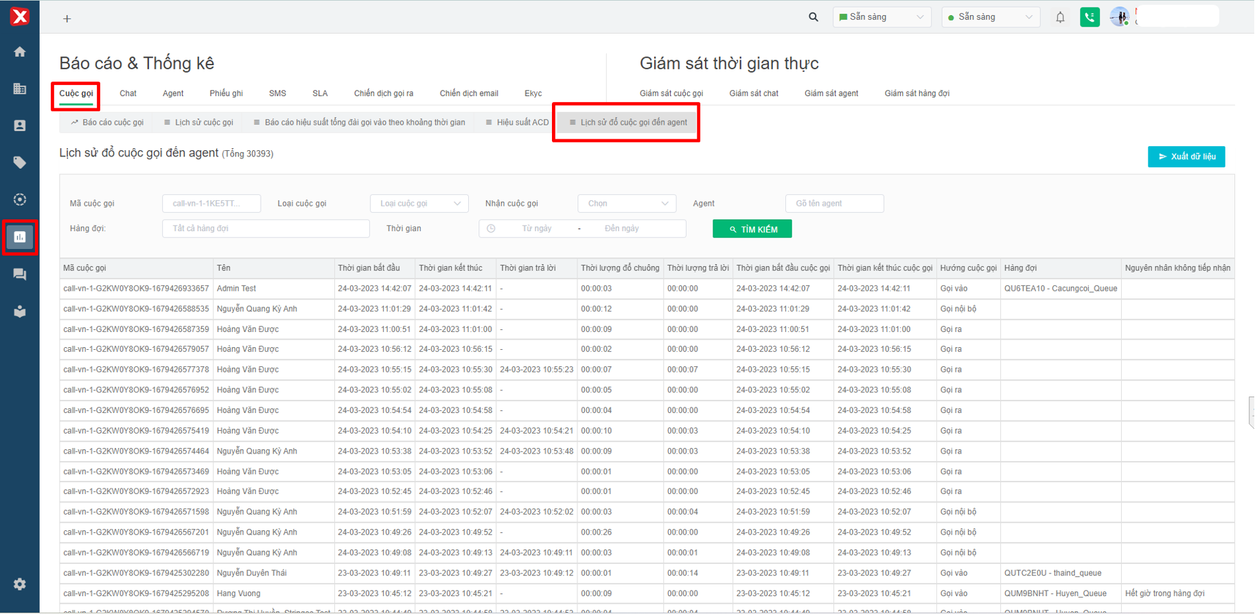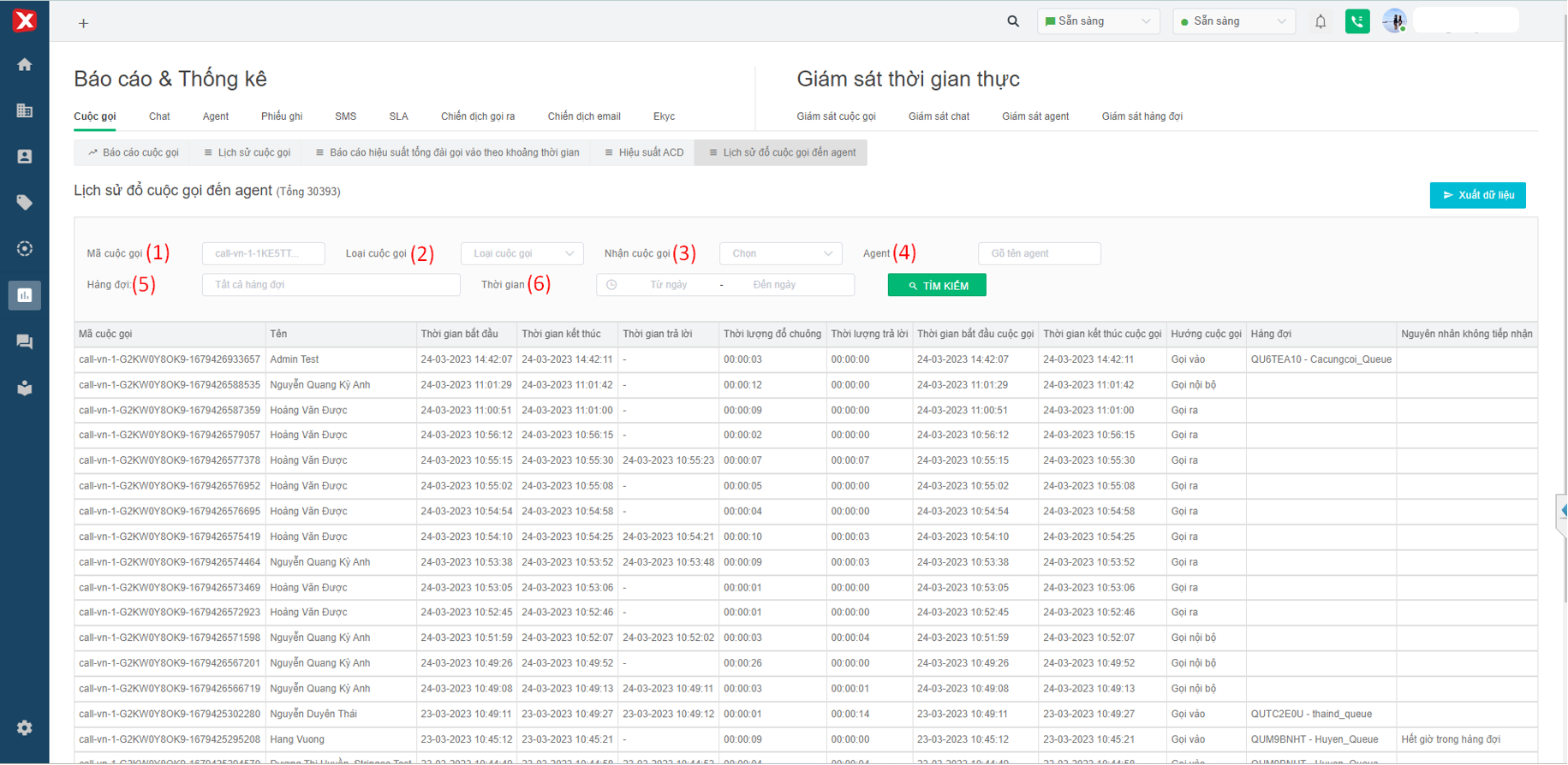 Hình 1: Báo cáo thống kê Lịch sử cuộc gọi đổ đến Agent