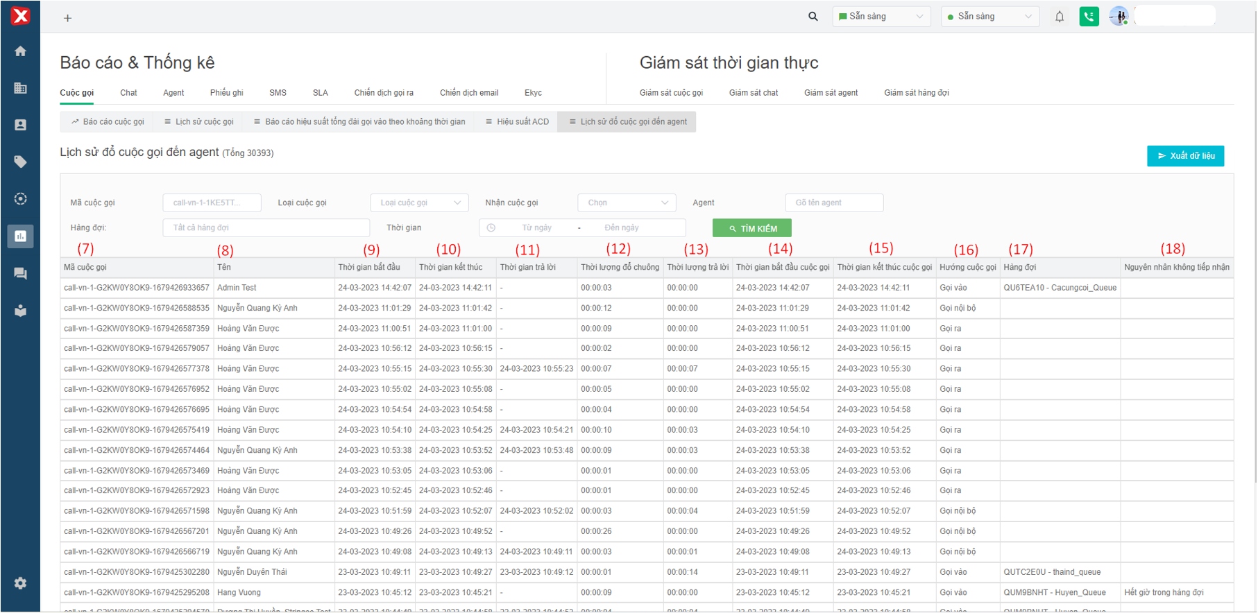 (14) Thời gian bắt đầu cuộc gọi: thời điểm cuộc gọi bắt đầu đổ vào hàng đợi.