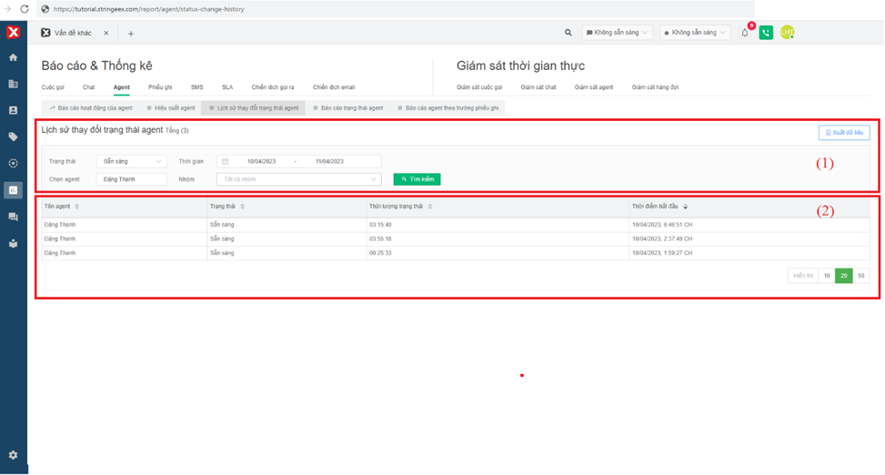 Báo cáo lịch sử trạng thái agent ghi nhận lịch sử thay đổi trạng thái và thời gian tương ứng, giúp quản lý kiểm tra thời gian làm việc và sẵn sàng tiếp nhận cuộc gọi