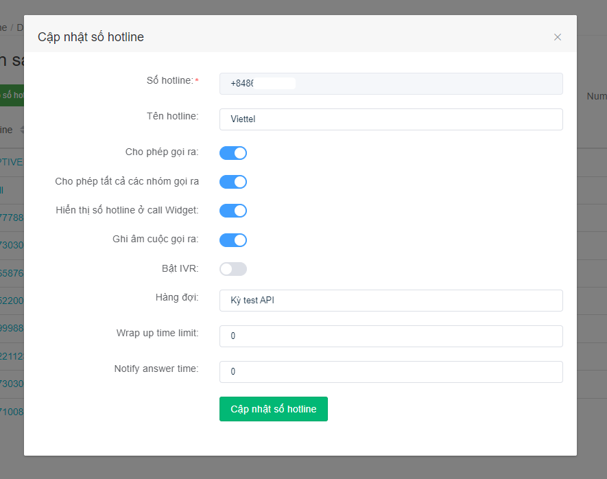 * **Cho phép gọi ra:** bật/tắt tính năng gọi ra cho số hotline.