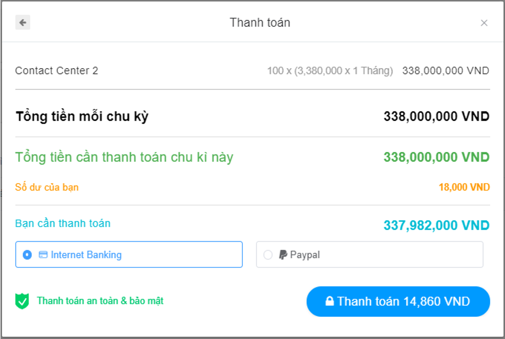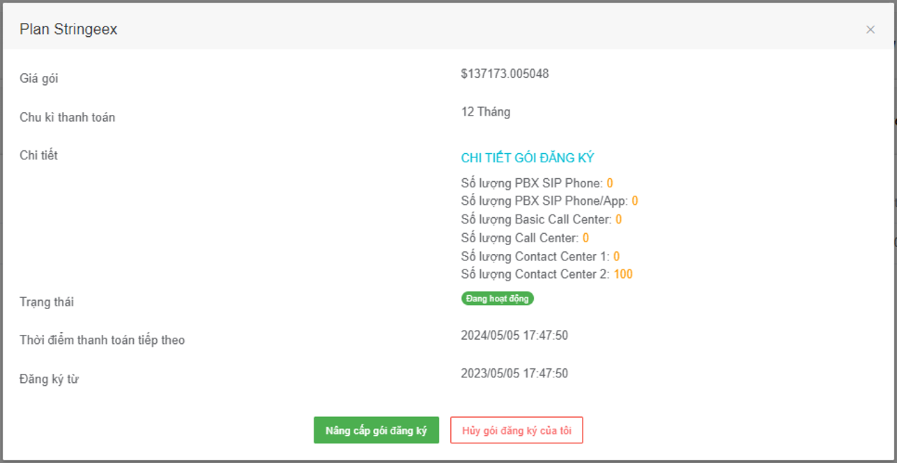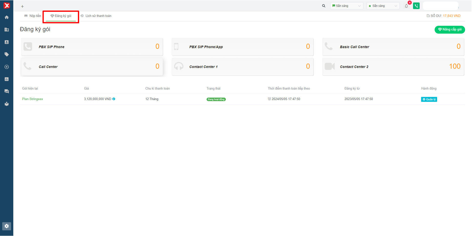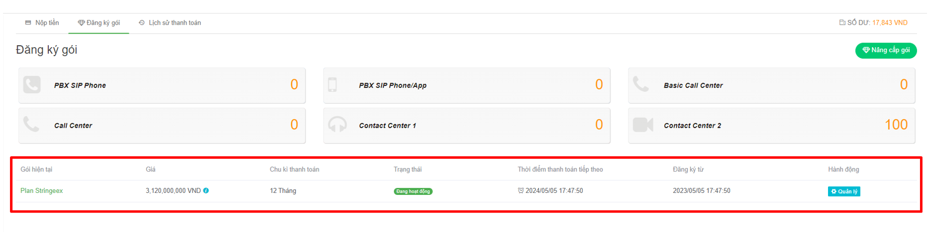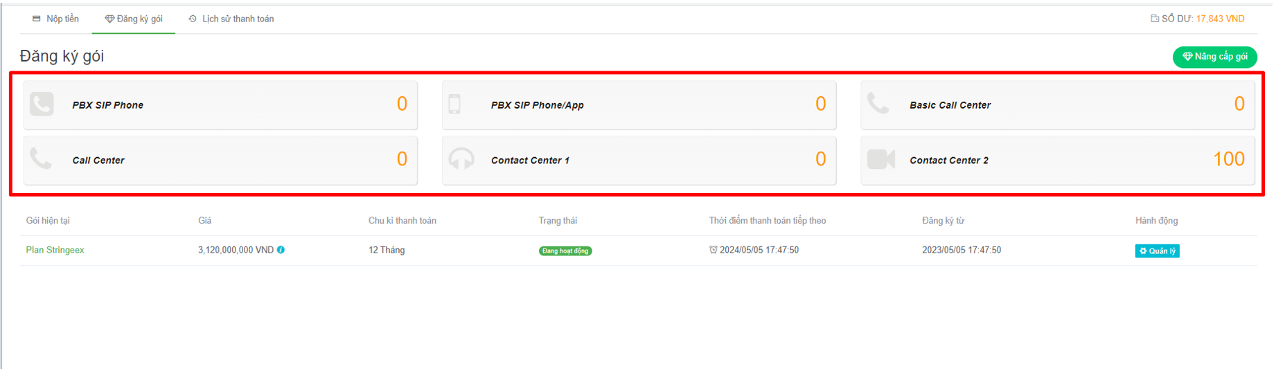 &#x20;     **Ví dụ:** như hình 1.4 thì người dùng đang sử dụng gói dịch vụ là Contact Center 2 với số lượng tài khoản là 100.