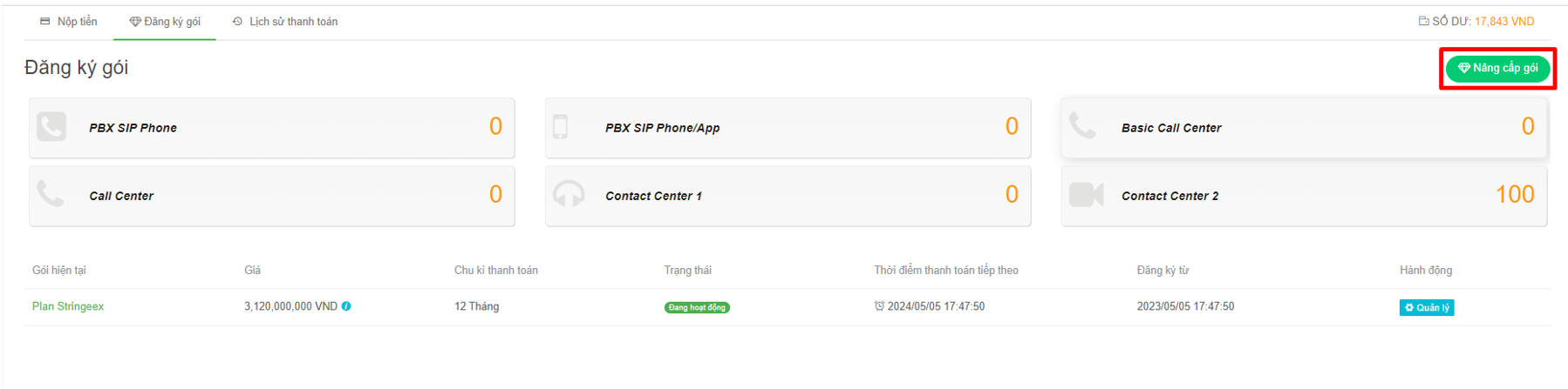 Tại đây người dùng có thể xem được gói dịch vụ đã đăng ký và có thể nâng cấp lên gói cao hơn nếu cần thiết đối với nhu cầu.