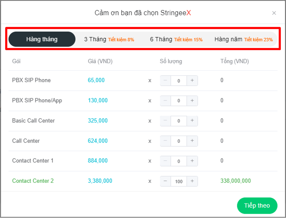 Sau khi hoàn tất việc lựa chọn gói dịch vụ người dùng tiến hành thanh toán bằng cách ấn nút “Tiếp theo”.