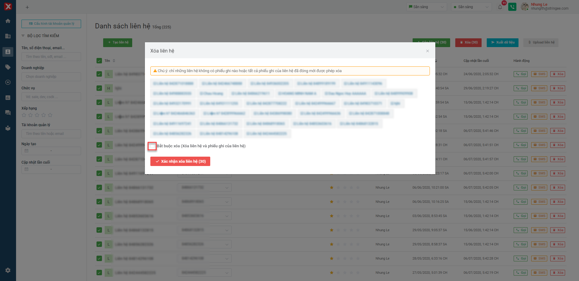 Bước 5: hệ thống hiển thị pop-up để người dùng xác nhận thông tin trước khi xóa. Người dùng click Xác nhận xóa liên hệ nếu các thông tin đã chính xác. Riêng tài khoản admin có thêm nút lựa chọn Bắt buộc xóa (xóa liên hệ và phiếu ghi của liên hệ), admin click lựa chọn này để xóa các liên hệ trong danh sách đã chọn, kể cả liên hệ có phiếu ghi chưa ở trạng thái Đóng. Nếu admin không click lựa chọn này, hệ thống sẽ không cho phép xóa các liên hệ còn phiếu ghi chưa ở trạng thái Đóng.