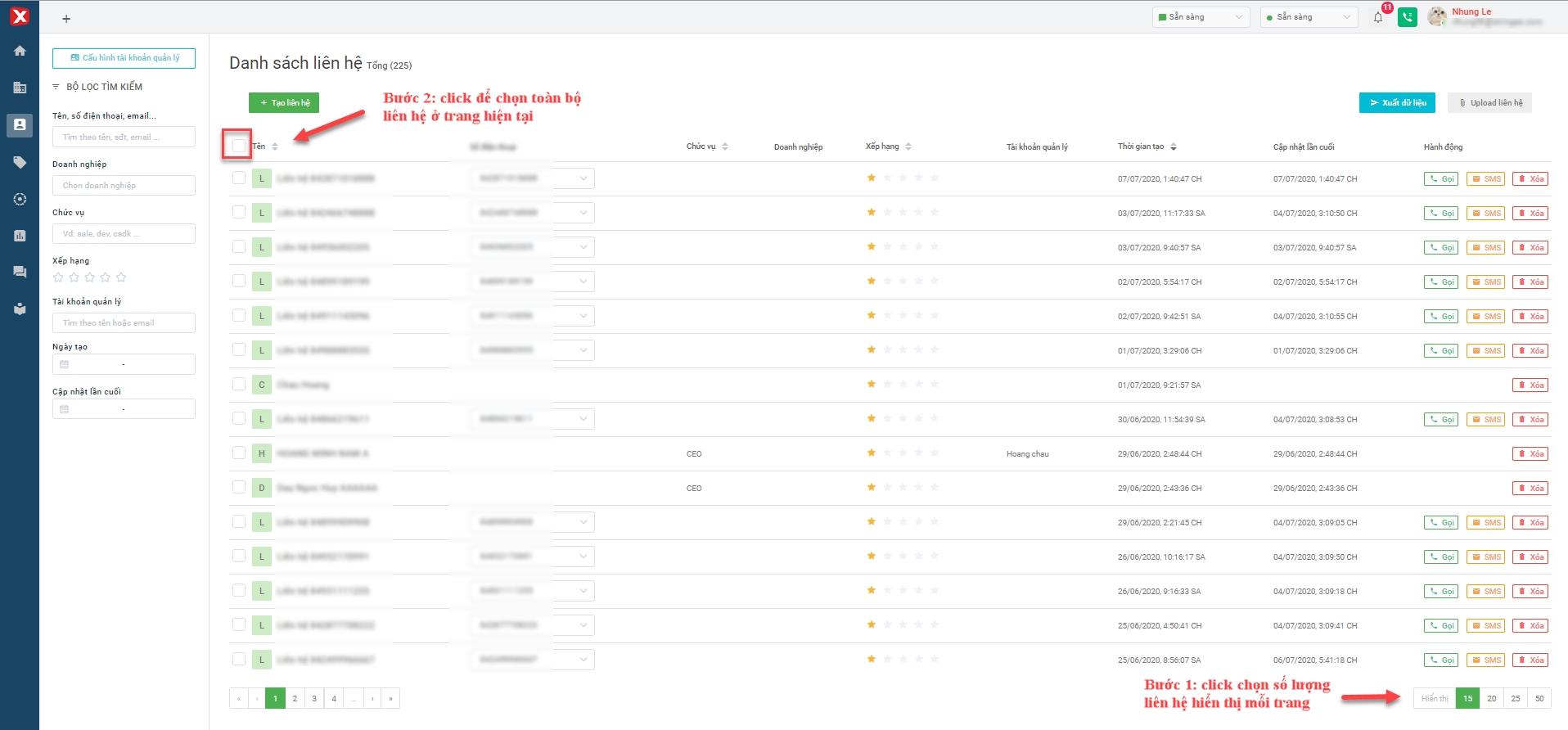 Bước 1: click chọn số lượng liên hệ hiển thị ở mỗi trang, doanh nghiệp có thể chọn 50 để thao tác được nhanh nhất.