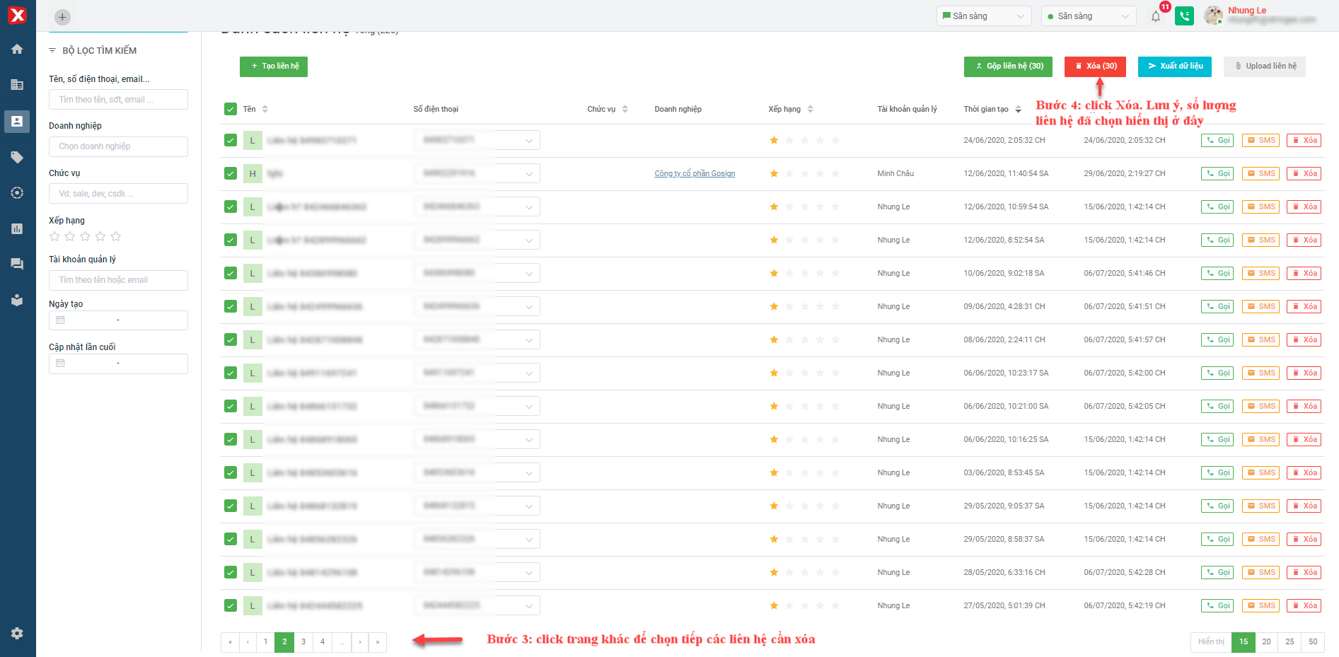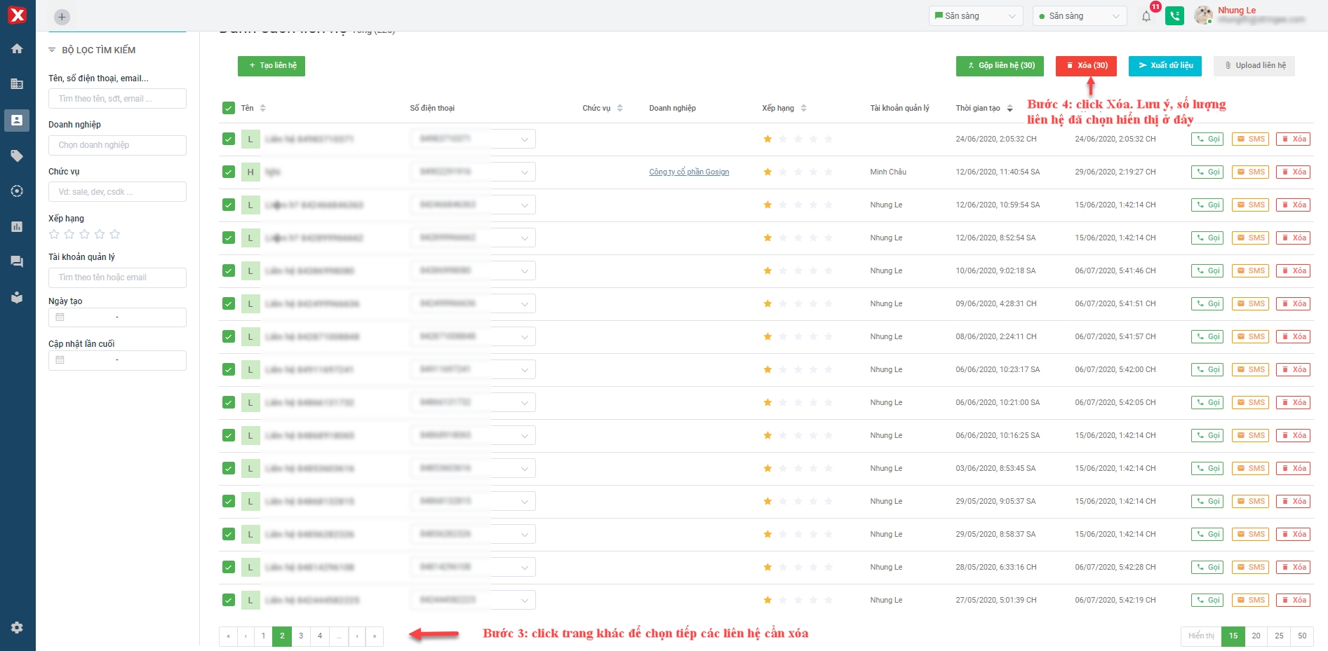 Để xóa nhanh và hàng loạt nhiều liên hệ, doanh nghiệp truy cập menu Liên hệ và thao tác theo các bước sau: