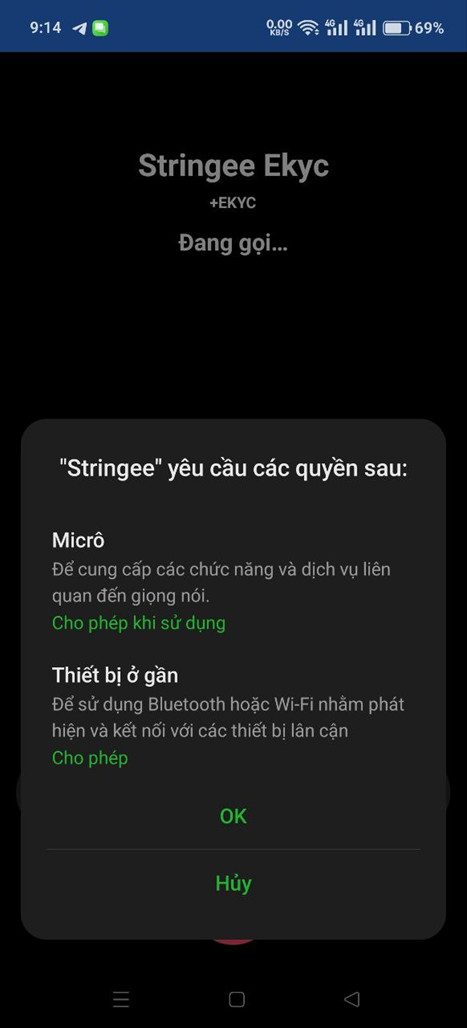 * Bước 9: Cấp quyền sử dụng micro. Người dùng bấm vào OK (Đồng ý) để cho phép phần mềm sử dụng micro khi thực hiện cuộc gọi. Sau khi cấp quyền, cuộc gọi xác thực bắt đầu thực hiện, người dùng làm theo hướng dẫn của nhân viên tổng đài để xác thực định danh.
