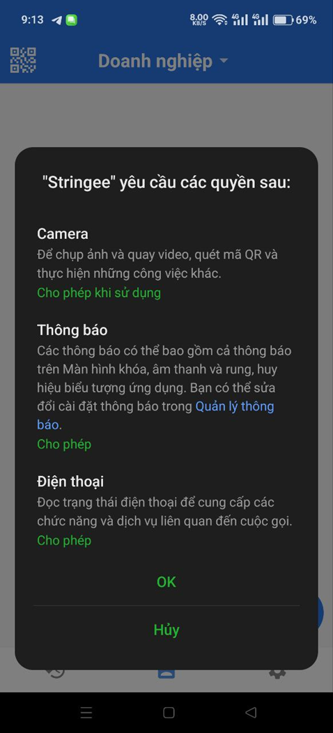 * Bước 5: Cấp quyền truy cập. Phần mềm sẽ yêu cầu các quyền cần cấp để có thể thực hiện cuộc gọi, người dùng bấm OK (Đồng ý) để xác nhận cấp quyền cho ứng dụng.