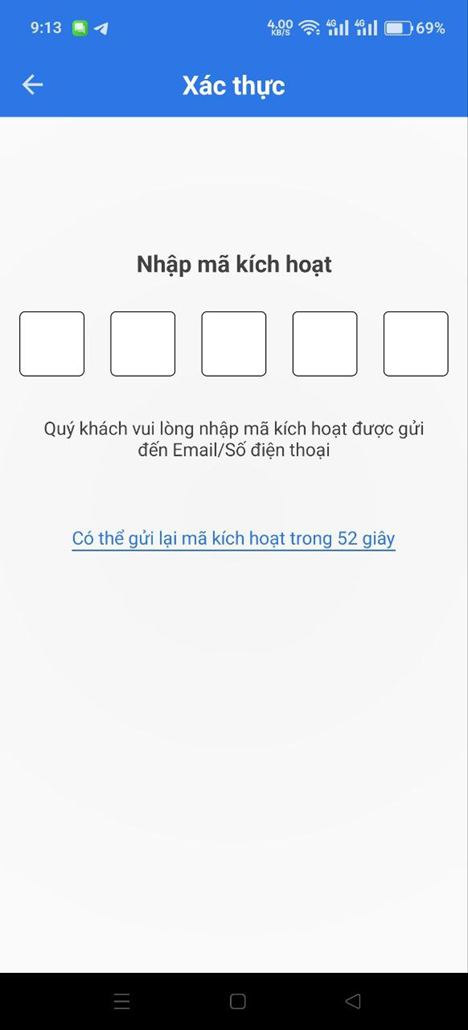 * Bước 3: Nhập mã kích hoạt. Sau khi bấm đăng nhập ở bước 2, hệ thống sẽ gửi mã OTP về số điện thoại. Người dùng nhập mã này vào các ô tương ứng, sau khi nhập đúng OTP, hệ thống chuyển sang màn hình nhập tên ở bước 4.